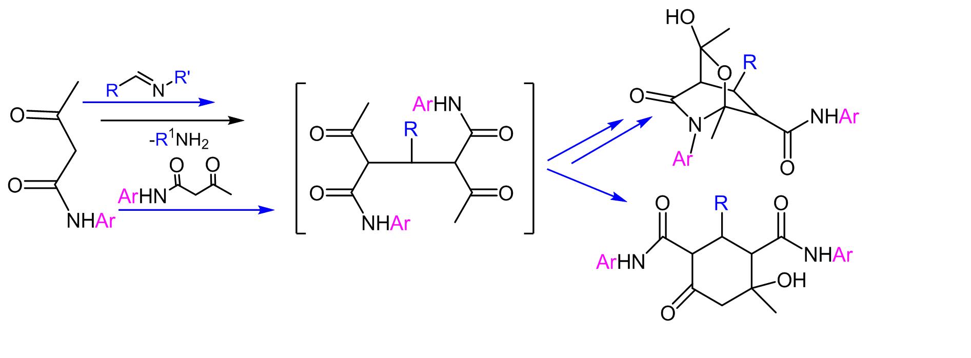 - Պարզվել է արալդիմինների և ացետոքացախաթթվի արիլամիդների փոխազդեցության քեմոսելեկտիվությունը։ Ցույց է տրվել, որ ներմոլեկուլային ցիկլումը կախված ելային մոլեկուլներում առկա տեղակալիչների էլեկտրոնային բնույթից ընթանում է կամ 3-արիլ-N,6-դիարիլ-3-հիդրօքսի-1,3-դիմեթիլ-5-օքսո-2-օքսա-6-ազաբիցիկլո[2,2,2]օկտան-7-կարբօքսամիդների (հետերոցիկլում) կամ 4-հիդրօքսի-4-մեթիլ-6-օքսո-2-արիլ-N1,N3-դիարիլցիկլոհեքսան-1,3-դիկարբօքսամիդների (կարբոցիկլում) կամ էլ դրանց խառնուրդի առաջացմամբ։