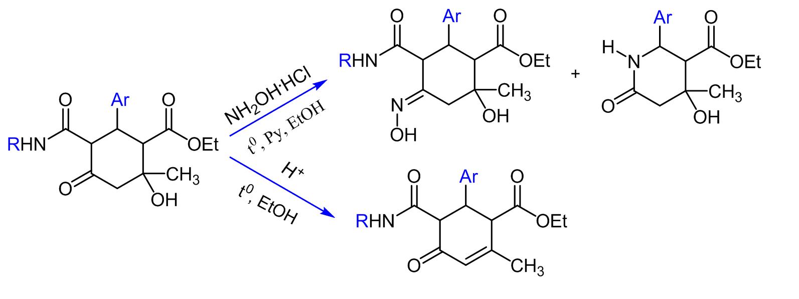 - Ցույց է տրվել, որ էթիլ 6-արիլ-5-(արիլկարբամոիլ)-2-հիդրօքսի-2-մեթիլ-4-օքսոցիկլոհեքսանկարբօքսիլատների և հիդրօքսիլամինի հիդրոքլորիդի փոխազդեցությունը բացի սպասվելիք համապատասխան օքսիմներից, որոշ դեպքերում բերում է նաև էթիլ 4-հիդրօքսի-4-մեթիլ-6-օքսո-2-արիլպիպերիդին-3-կարբօքսիլատների առաջացման: Առանձին փորձով հաստատվել է, որ վերջիններս չեն գոյանում ելային ցիկլոհեքսաններից, այլ հանդիսանում են համապատասխան օքսիմների և հիդրօքսիլամինի հիդրոքլորիդի հետագա փոխազդեցության արդյունք: