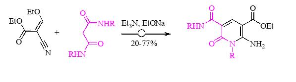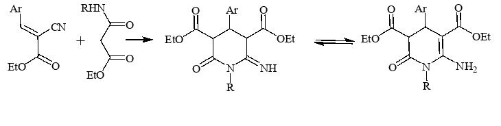 - Մշակվել է արիլմեթիլիդենցիանքացախաթթվի էսթերի և մալոնաթթվի արիլամիդոէսթերների փոխազդեցությունից դիէթիլ 6–ամինո–1,4–դիարիլ–2–օքսո–1,2,3,4–տետրահիդրոպիրիդին–3,5–դիկարբօքսիլատների ստացման եղանակ։